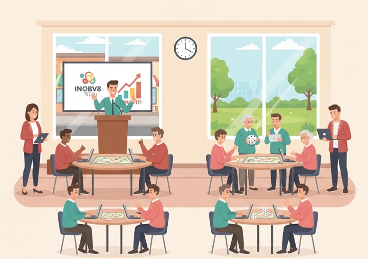 弊社代表が企業様に赴き、社員全員で12ヶ月の経営を疑似体験するボードゲーム型研修を実施。